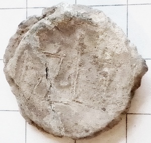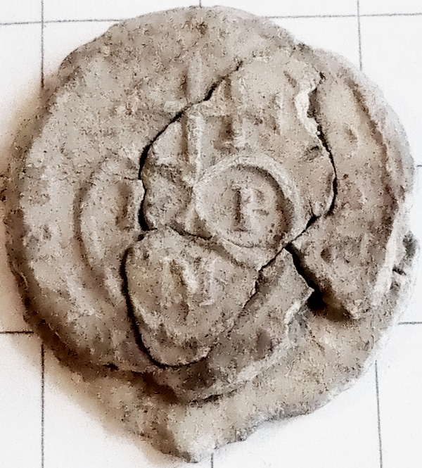 Waarschijnlijk een deelbewerkerslood uit de 17de eeuw gevonden en gedoneerd door Rik Devriese. Onzekere datering.