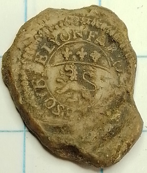vz: wapen van Lyon (drie fleur-de-lis (lelie) met hieronder een naar links klauwende leeuw) met de tekst “FABRIQUE DE SOYE (silk/zijde) DE LYON”