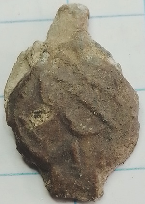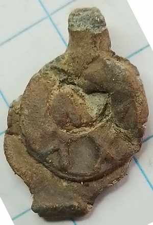vz: lijkt een wapenschild op te staan met twee diagonalen strepen van links boven naar rechts onder. Onder dit schild een cijfer 11 of 14 wat op een jaartal zou kunnen duiden