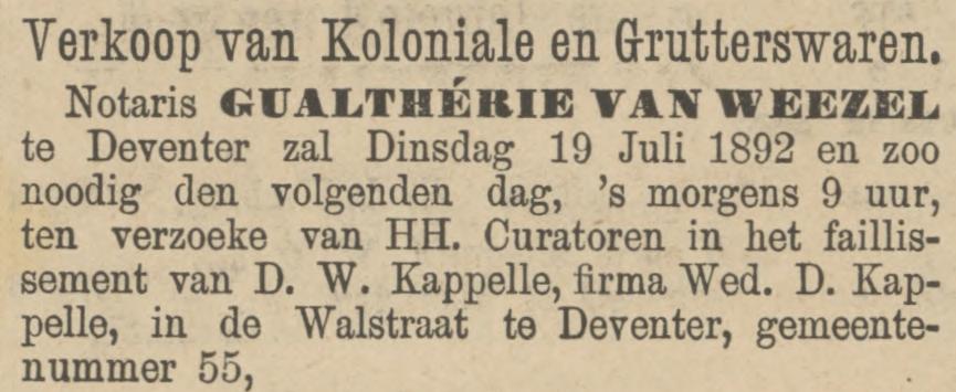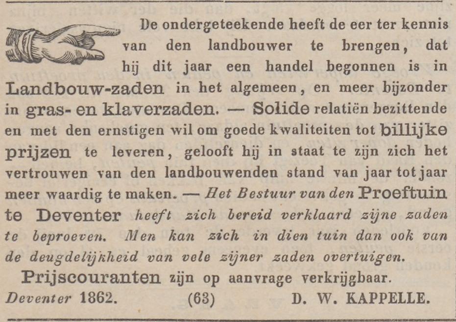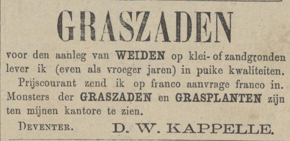 Zaadhandel D.W. Kappelle uit Deventer. Het bedrijf is opgericht in 1862. In 1874 wordt er nog steeds gehandeld in zaden. Een zoon (waarschijnlijk) van D.W. Kappelle met dezelfde naam vertrekt rond 1880 naar Borneo, vandaar dat in die contreien deze naam ook weer steeds opduikt. In 1892 zien we dat het bedrijf dat nu handelt in koloniale waren en inmiddels in handen van de weduwe van D.W. Kappelle, failliet is gegaan.