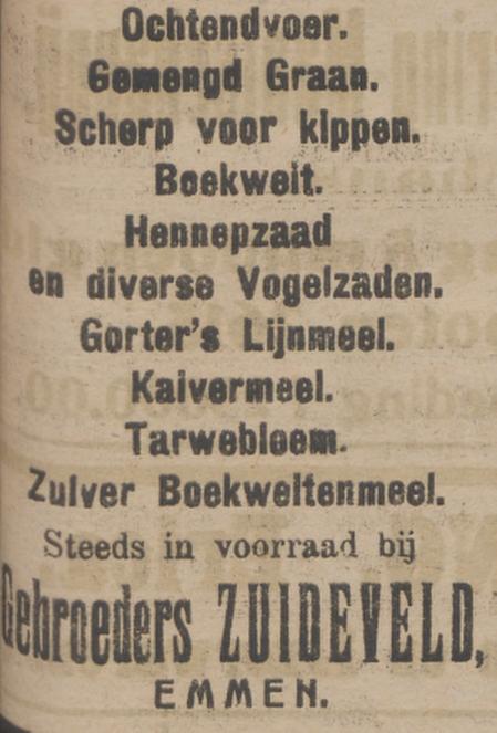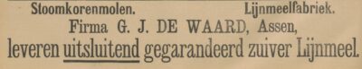 Loodjes voor Gorter zuiver lijnmeel. Rond 1901 adverteert dit bedrijf uit Nieuw Amsterdam met hun eigen zuiveren lijnmeel. Lijnmeel wordt veel als veevoeder verkocht maar wordt ook veel vervalst. Vandaar de melding “zuiver”. In 1911 is er nog een pleidooi in de krant van de eigenaar J. Gortner voor keuring van lijnmeel. Rond 1915 zien we de laatste indirecte vermelding.
