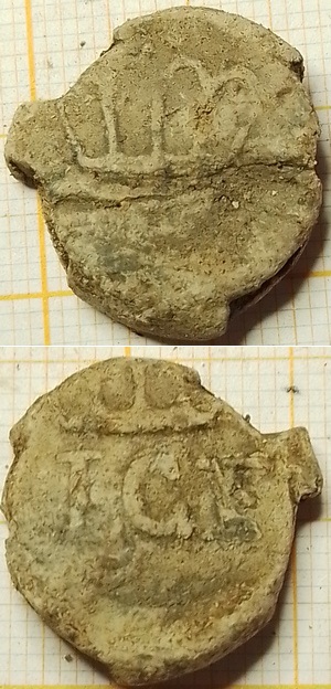 Op dit lood staan op beide zijden de gekroonde letter I.C.F. of L.C.F. Wellicht dus een soort douaneloodje.