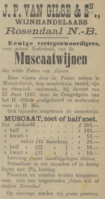 zegellood waarschijnlijk van J.P. van Gilse & Zoon wijnhandelaars uit Rosendaal. Zij leveren ook mis-wijnen voor kerkelijke aangelegenheden. In advertenties zien we dit bedrijf voor het eerst in 1890 en voor het laatst in 1906