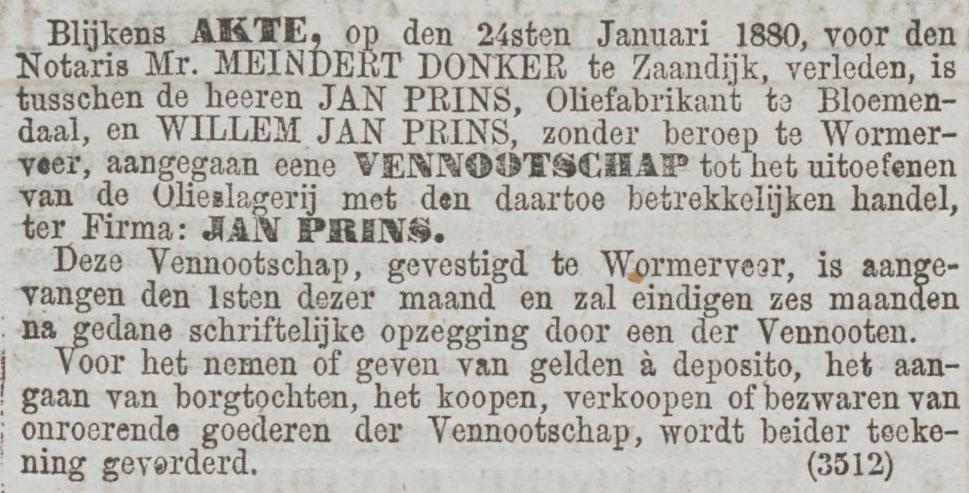 In 1880 gaat hij een samenwerkingsverband aan met Willem Jan Prins. Het bedrijf blijft Jan Prins heten,