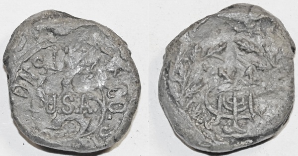 Loodje waarop 2 korenhalmen lijken te staan. Hieronder een vergelijkbaar loodje. Hierbij is duidelijk dat het om een company (co) gaat uit de U.S.A. In combinatie met de korenhalmen lijkt mij dit om meel te gaan. Een logische tijd dat er meel vanuit de VS geimporteerd is lijkt mij WWI. Waarschijnlijk dus een loodje uit de periode 1914-1918.