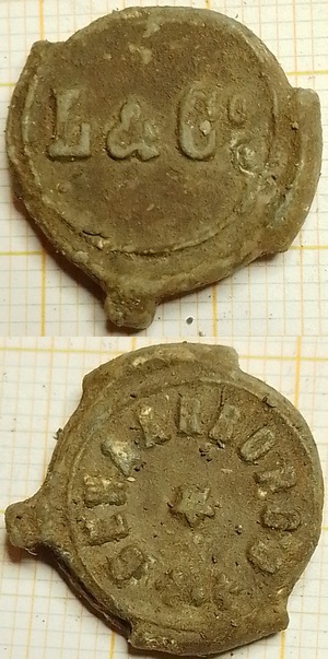 Loodjes (2 stuks) van de sigarenfabiek Lurmans & Co. Lurmans & Co. Deze hadden in diverse plaatsen fabrieken waaronder een fabriek aan de Kanaalstraat in EIndhoven. Nadat in 1870 een fabriek was begonnen door J.A. Schutjes & A. van de Ven, werd deze in 1873 overgenomen door J.F. Lurmans & J. van Schaick (Lurmans & Co.), die ook een bedrijf in Arendonk hadden. In 1905 wordt het merk L&Co gedeponeerd. Men bracht ook merken als Clown en Clowness, maar ook Cigares du Peuple, ofwel Volks Sigaren. De fabriek in EIndhoven heeft bestaan tot 1911 tot deze werd overgenomen door Mignot & de Block sigarenfabrieken. Tot ca 1927 zien we advertenties van dit bedrijf.