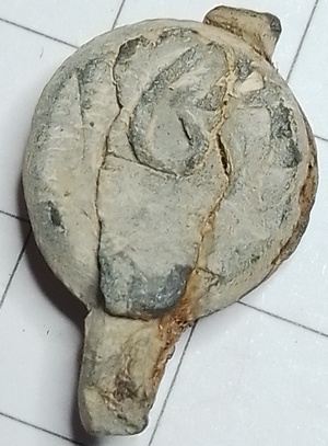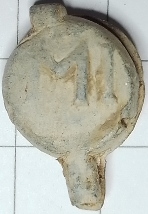 Dit lijkt op een lakenlood met de tekst “M.I.” of “I.W.”. Op de keerzijde staan de cijfers 164. Wellicht is er een cijfer afgevallen en gaat het om een lood uit de veertiger jaren van de 17de eeuw.