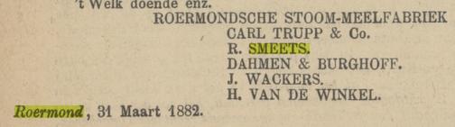 In 1877 werden de invoerrechten op meel afgeschaft en werd de markt overspoeld met goedkoop graan uit onder andere de VS. Dit heeft kennelijk veel invloed op de fabriek van Smeets want in 1882 zien we hem onder het samenwerkingsverband Roermondsche Stoom-Meelfabriek werken.