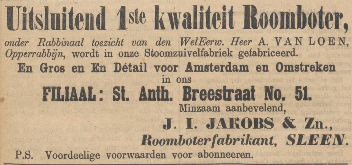 Een wit geschilderd loodje voor roomboter. Wellicht van de firma Jacobs uit de St. Anth. Breestraat 51 uit Sleen. Het loodje is gevonden in Coevorden, zo’n 10km van Sleen vandaan.