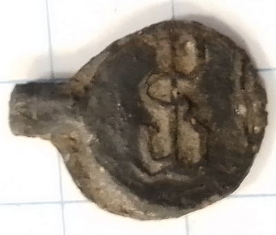 Loodje met iets wat lijkt op een vierpotig anker met ankertouw. Tijdens opgravingen in Enkhuizen is een vergelijkbaar loodje gevonden. Hierbij heeft men dit loodje gedetermineerd als een deelbewerkingslood (lakenlood) met een huismerk. Zie bladzijde 41 en 42 nr 61 Enkuizen De Baan (fase 2)