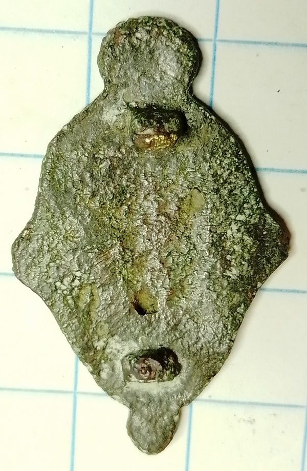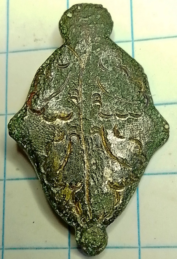 Mantelspeld in een soort golvende ruitvorm. Deze is gegrafeerd in een soort bladmotief en is verguld geweest. Op de achterzijde het afgebroken bevestigingsmechanisme zichtbaar (2 pinnen).