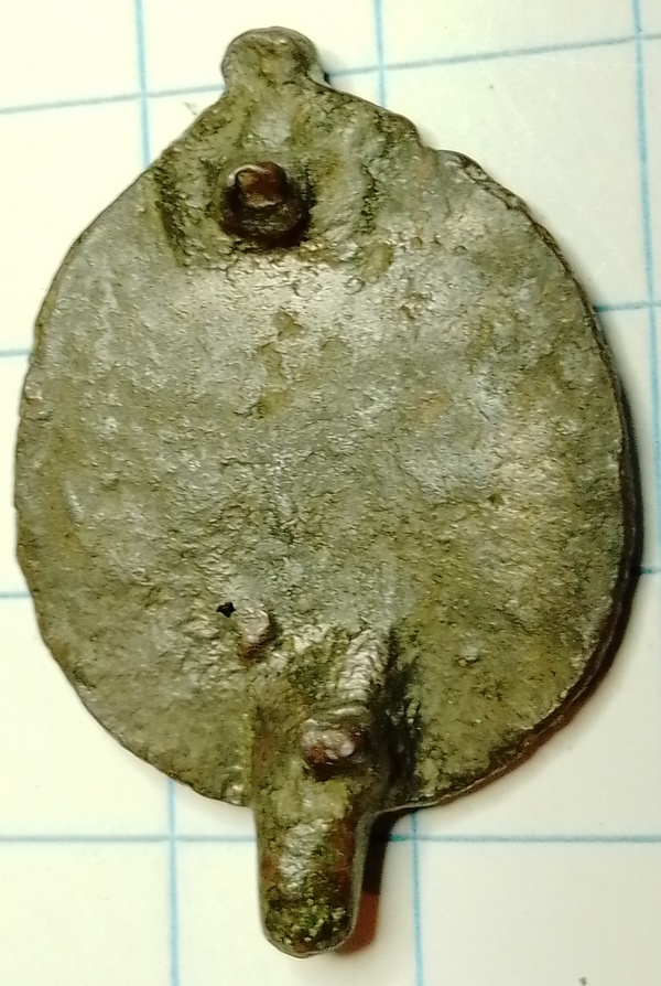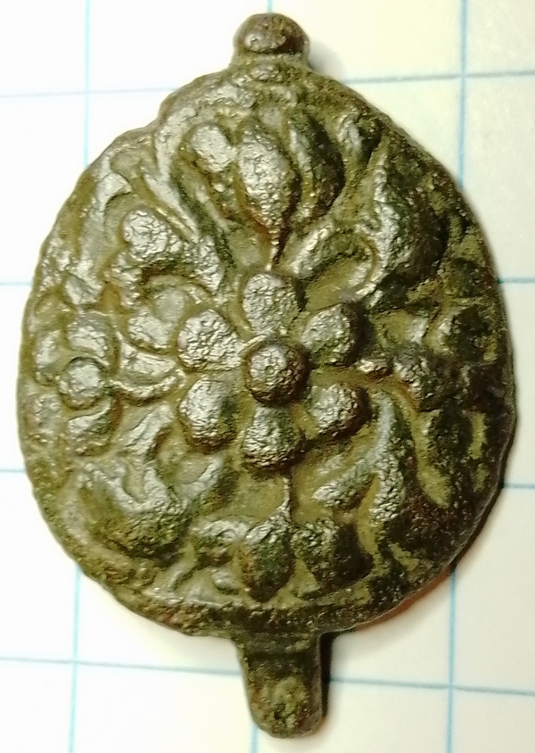 Mantelspeld met bloemmotief. In het midden een 5 bladige bloem. Op de achterzijde een (afgebroken) bevestigingsconstructie.
