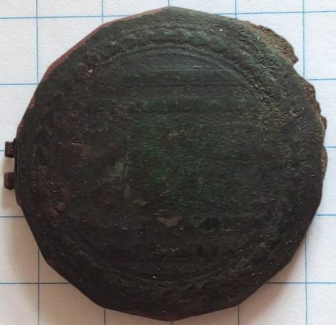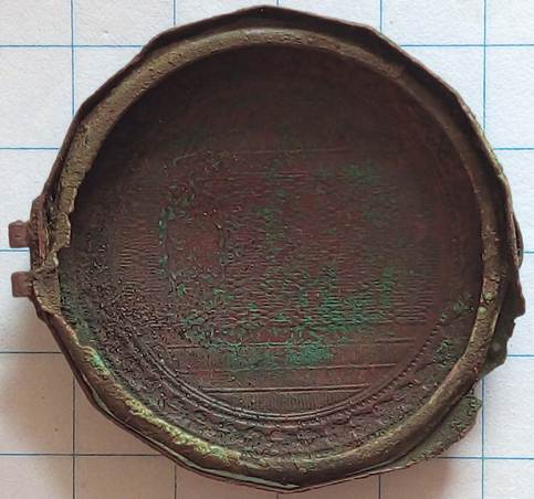 Medaillon (voorheen verguld) die opengeklapt kon worden. Aan de binnenzijde zit nog een losse sluitring. Hierin zat totaal verbrijzeld glas met iets wat leek op karton. Waarschijnlijk heeft er een foto of schilderijtje in gezeten. Datering rond 1900.