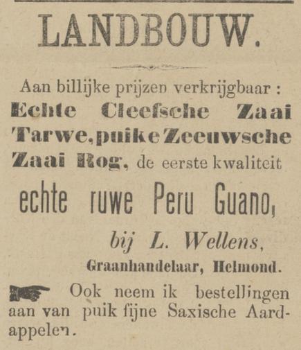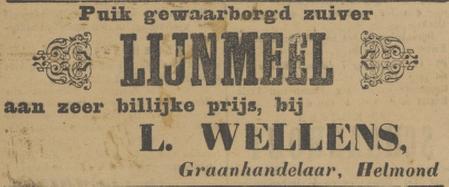meellood van de graanhandelaar l. Wellens uit Helmond. Eerste advertentie uit 1882 waarin hij ook handelde in guano mest, zaaigoed en aardappelen.