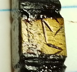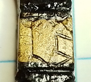 Mesje met gegrafeerde messing stootplaat waarin letters/symbolen gegrafeerd staan. Uit het centrum van Den Bosch, gevonden in de stort bij de Kruithoorn