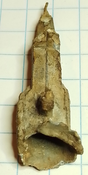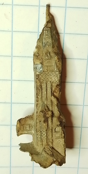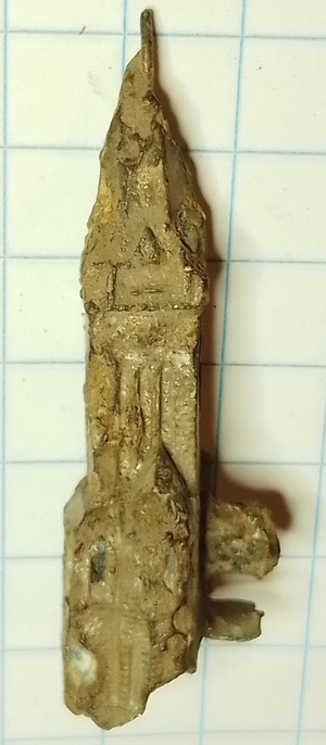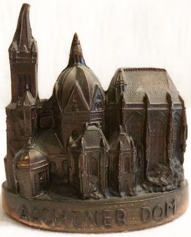 Miniatuur toren van een kathedraal die onderdeel is geweest van een souvenir. Dit soort souvenirs komen voornamelijk uit de eerste helft van de 20ste eeuw. Deze toren heeft veel gelijkenissen met de toren van de dom uit Aken.