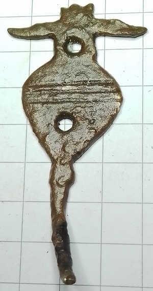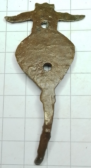 Muurhaak met peervormig lichaam en kroon en 3 ingeslagen lijnen. Datering 1600-1650