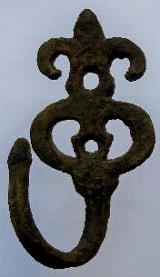 Opengewerkte muurhaak met een ovaalvormig lichaam bekroond met een lelie (dit deel is afgebroken). De haak is gedeeltelijk afgebroken.