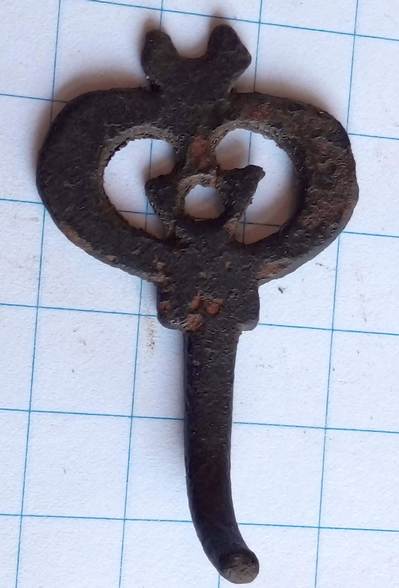 Opengewerkte muurhaak met een ovaalvormig lichaam bekroond met een lelie (dit deel is afgebroken). De haak is gedeeltelijk afgebroken.