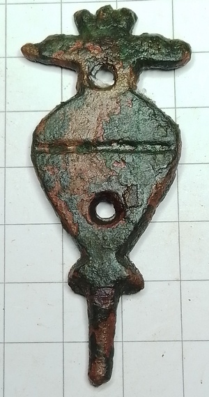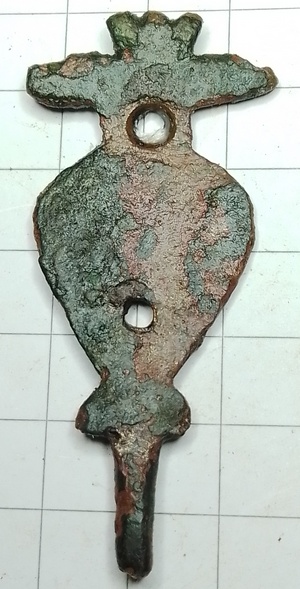 Muurhaak met peervormig lichaam en kroon en ingeslagen lijn. Datering 1600-1650