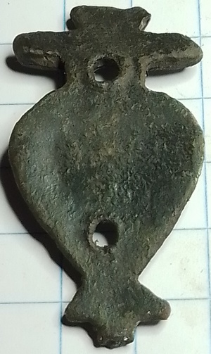 Muurhaak met peervormig lichaam en kroon en ingeslagen lijn. Datering 1600-1650