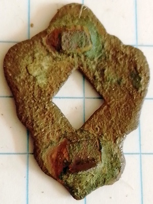 Waarschijnlijk een mantelspeld. Hierop is een hartje te zien en wat krulversiering. In het midden zit een ruitvormige opening. Op de achterzijde platte staafjes wat wellicht het afgebroken sluitmechanisme is geweest.