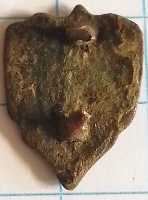 Beslag in de vorm van een schild. Op het schild loopt een verticale balk. Twee (afgebroken) bevestigingspinnetje. Gezien de grootte ca18mm zou het ook riembeslag kunnen zijn.