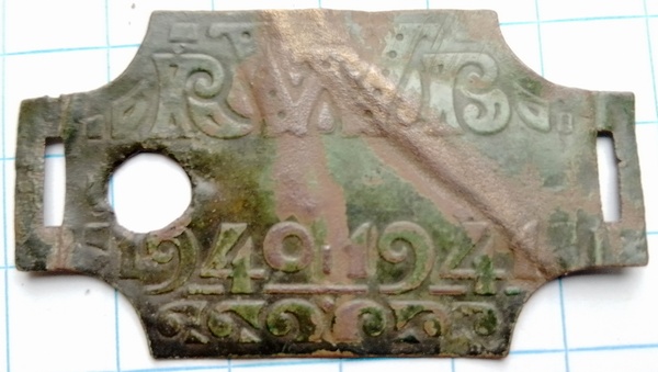 Rijwielbelasting-plaatje 1940-1941 met gat. Dit betekende dat dit kosteloos was.