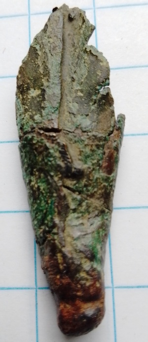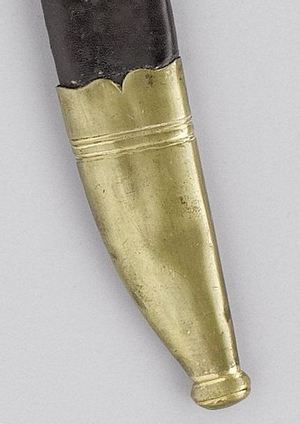Koperen punt van een schede van een mes, zwaar of ander puntig voorwerp.