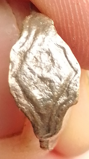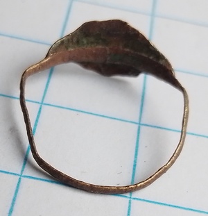 Eenvoudige koperen vingerring. Hier lijkt een lemniscaat (oneindigheid) of twee bloemetje op het zegelvlak te staan. Datering 1450-1600