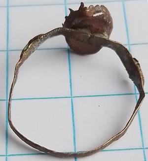 Eenvoudige koperen vingerring me chaton (zetting waarbij de steen door pootjes of klauwtjes wordt vastgehouden). Steentje ontbreekt.