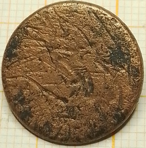Een object dat er uitziet als een platte knoop. Op de achterkant zit echter helemaal aan de zijkant een afgebroken bevestiging. Wellicht is het net zoiets als een koppelhaak.