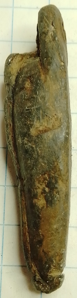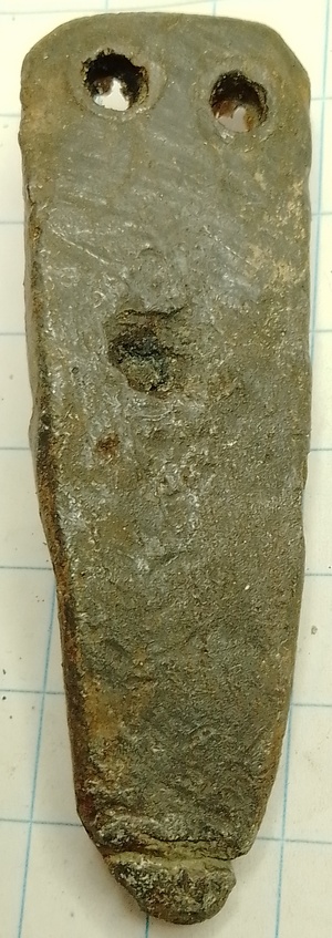 Onbekend object van lood? met twee bevestingsgaatjes. Dit is wellicht een weefgetouw gewicht. Ook is het mogelijk dat hiermee losse leistenen werden vastgezet.