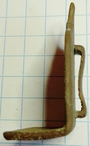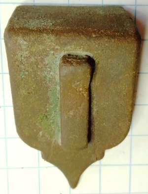 Een schildvormig object met op de achterzijde een uitsparing waar een riem of platte haak doorheen kan.