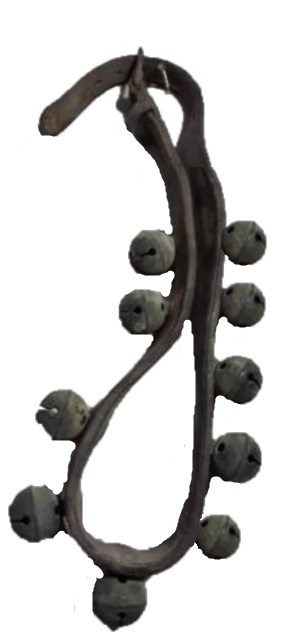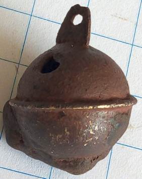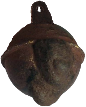 Koperen belletje waarschijnlijk voor op een paardentuig. Er staat hierop een afbeelding (in ijzer) van iets wat lijkt op een leeuw.