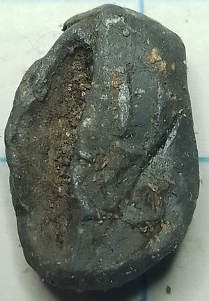 Pijploodje met afbeelding van wellicht een vleugel. Dit loodje heeft enige gelijkenis met een ander pijploodje gevonden in Amsterdam met hierop een griffioen(griffin). Een andere optie is dat dit een loodje is uit St. Gallen (Zwitserland).