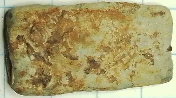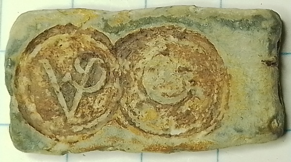 Pijplood met hierop twee cirkels. In de eerste cirkel lijkt een monogram te staan van de hoofdletter V en kleine letter S. In de tweede cirkel lijkt een U of O te staan. De beschrijving die bij dit lood zat was dat dit om een VOC lood gaat. Die bewering heb ik echter nog niet kunnen staven.