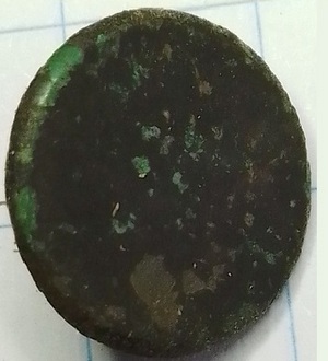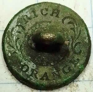 Platte knoop met op de achterkant de tekst “Rich Orange” (goud verguld).