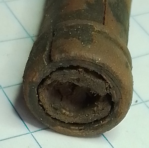 Pompstokhouder waar nog een stuk hout in zit. Aan de bovenkant is te zien dat het object verzilverd is geweest. Bij de detailfoto is zichtbaar dat in het loopje hout zit.