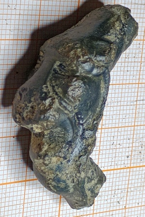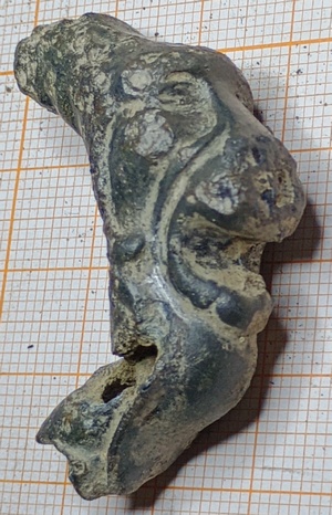 Tinnen pootje (afgebroken) met een afbeelding van een leeuwenkop. Dit soort pootjes zaten vaak aan theepotten/theelichtjes