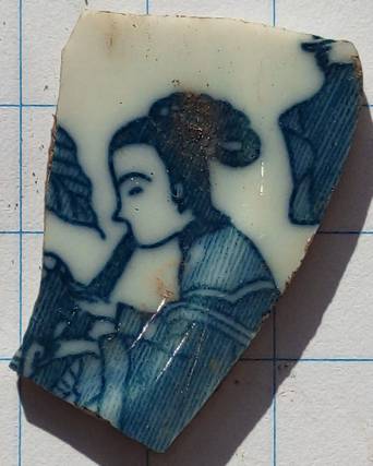 Stukje porselein waarop een afbeelding staat van iemand die een fluit speelt.