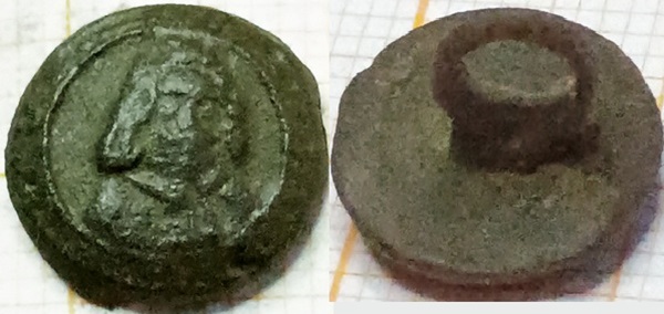 Klein knoopje (zonder oogje) van 11mm met hierop een afbeelding van iets wat lijkt op man van stand uit de 17de eeuw. Dit zou goed Michiel de Ruyter kunnen zijn die heel populair was. Onzekere datering 1600-1650