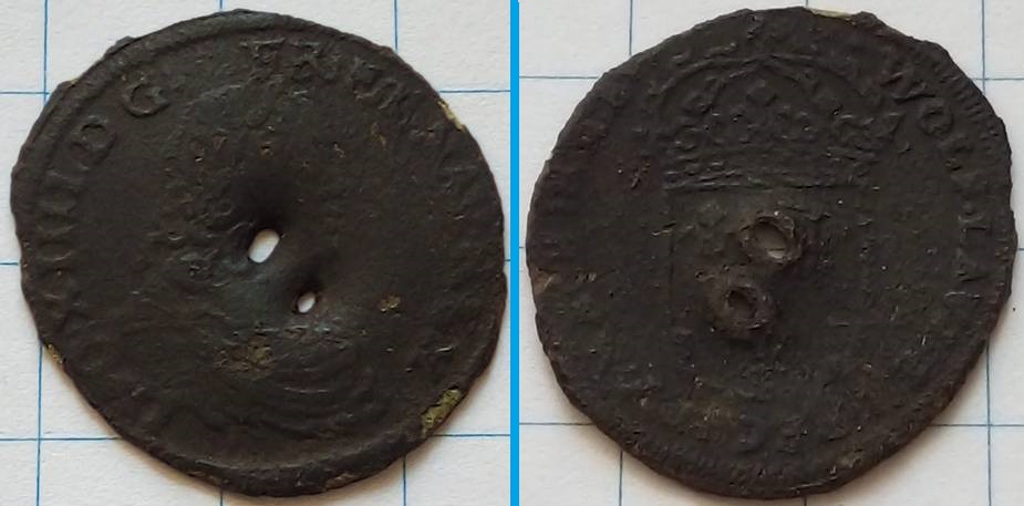 Opmerking: Deze rekenpenning lijkt als twee druppels water op de zilveren ecu van Frankrijk. Het kan dus zijn dat deze als vervalsing is ingezet. Dat kan verklaren waarom iemand er twee gaatjes in heeft gemaakt.