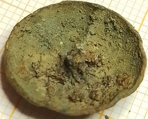 Dit beslag in de vorm van een bloemetje is hol. Het metaal lijkt te dun voor het oude riembeslag.