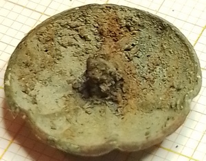 Dit beslag in de vorm van een bloemetje is hol. Het metaal lijkt te dun voor het oude riembeslag.