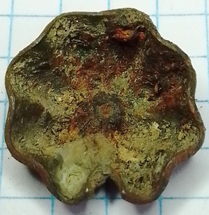 Dit beslag in de vorm van een gelobde schelp is hol. Het metaal lijkt te dun voor het oude riembeslag.
