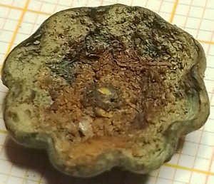 Dit beslag in de vorm van een gelobde schelp is hol. Het metaal lijkt te dun voor het oude riembeslag.