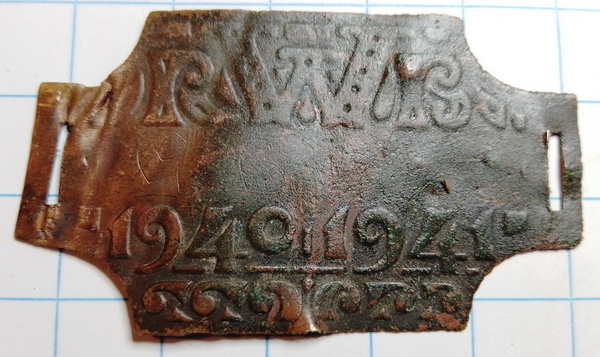 rijwielbelasting 1940 – 1941 van messing. Iemand heeft hier ooit letters ingekrast.