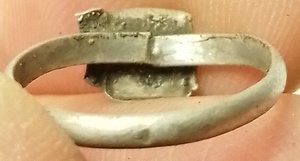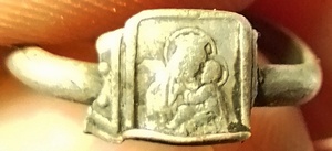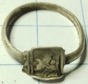 Zilver ringetje met hierop een vierkante afbeelding van Maria met kindje Jezus. Zo te zien zaten aan de zijkanten driehoekige vormen.