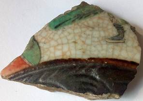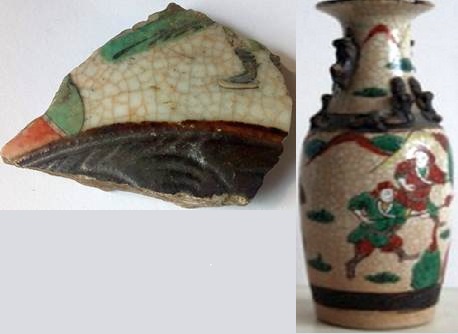 Meerkleurige scherf van Nanking porselein waarop nog net een voetje te zien is. Datering 19de/20ste eeuw. Dit soort porselein wat populair bij mensen die terug kwamen uit de West (Azië, VOC).
